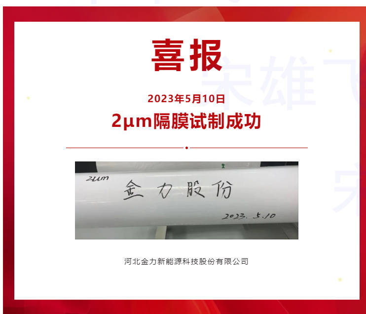 2023年5月10日,金力股份2μm隔膜试制成功并达到了大宽幅送样的水准。