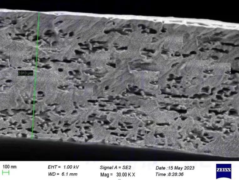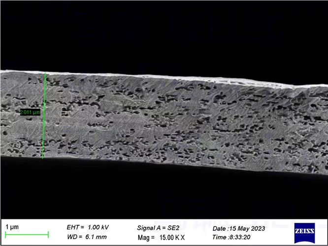 此次研发的2μm隔膜主要用于功能复合膜基膜或半固态电池用隔膜。产品特点是厚度极薄、透气度小、孔径大孔隙率大,具有一定的机械强度,在复合膜和半固态电池中起到很好的安全性阻碍和支撑作用。
