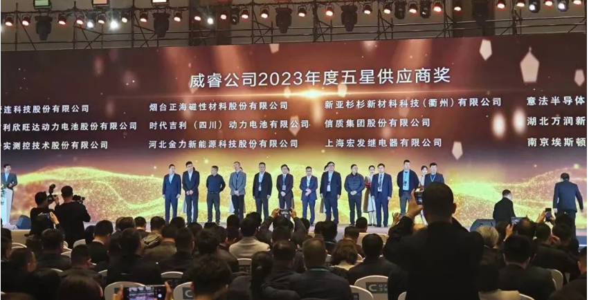 2024年3月11日,以“凝心聚力,勇攀高峰”为主题的威睿2023年度供应商伙伴大会在杭州国际博览中心举行。金力股份依托过硬的质量表现、稳定的交付和优质的服务,在众多企业中脱颖而出,荣获2023年度五星供应商奖。