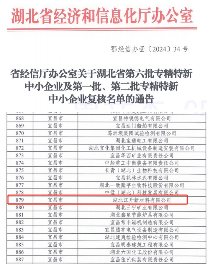 近日,湖北省经济和信息化厅发布了关于湖北省第六批专精特新中小企业名单的通告,金力股份旗下湖北江升新材料有限公司(以下简称湖北江升)被授予“湖北省专精特新中小企业”称号。